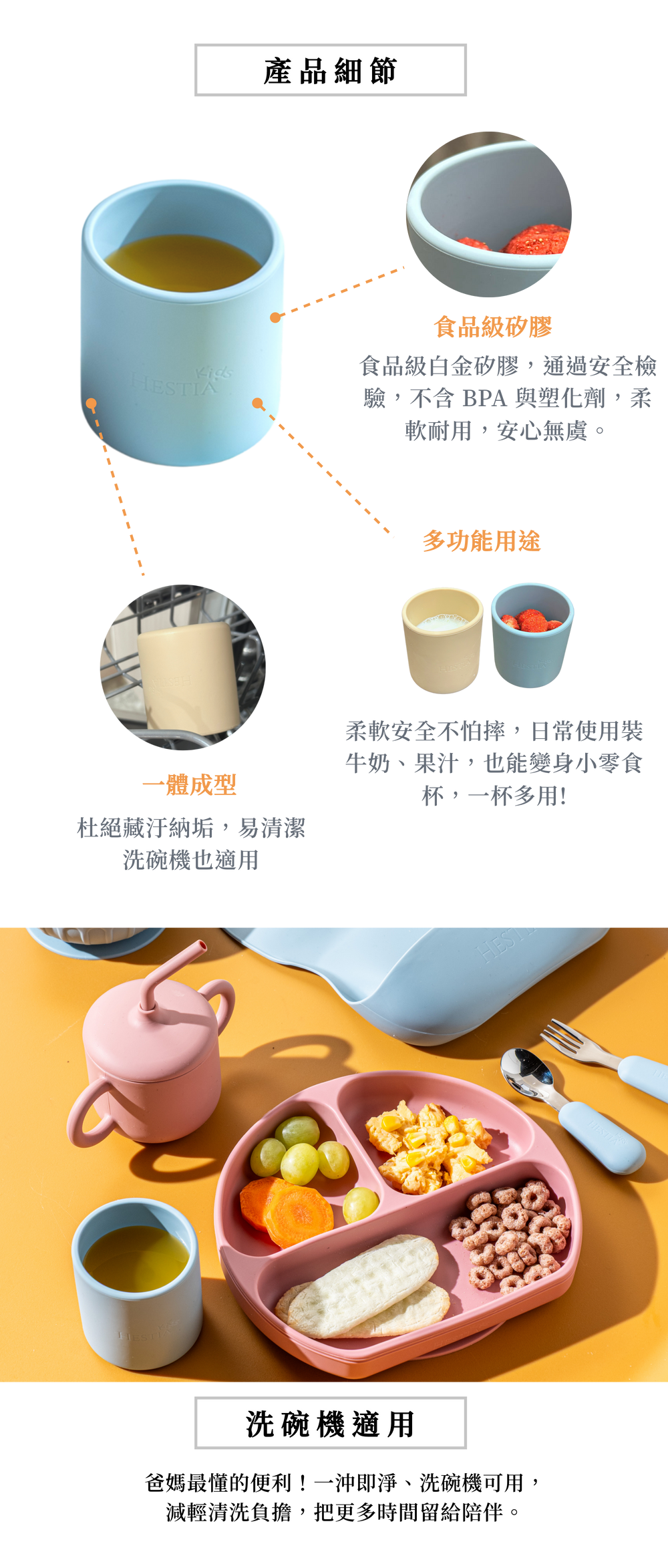 ● 一體成形:適合小手抓握,防止滑落,洗碗機適用